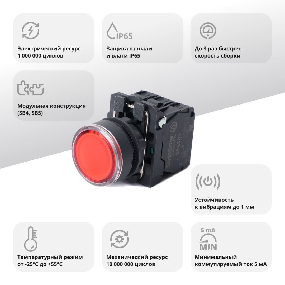Кнопка серии SB5 с подсветкой, в сборе, модульная, для монтажа в отверстия диаметром 22 мм, красная, в пластиковом корпусе. Напряжение питания блока подсветки - 24В DC. Количество контактов - 1НО+1НЗ. Устройства управления и сигнализации SystemeSig находят широкое применение в технологическом оборудовании и машинах, шкафах распределения и управления, промышленных предприятиях, объектах инфраструктуры, гражданском строительстве.