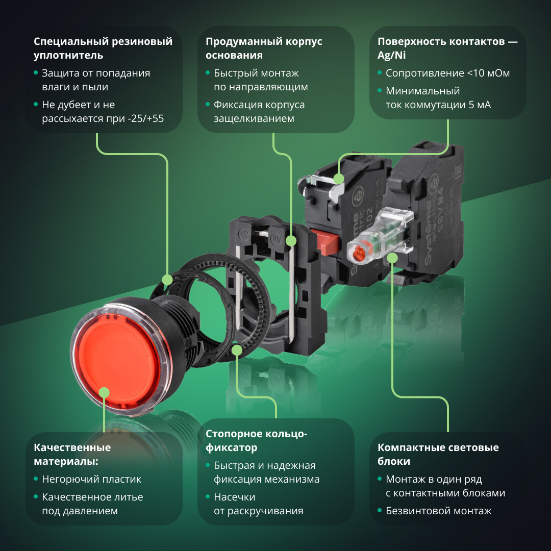 Широкие возможности расширения благодаря модульной конструкции|Устройства закрывают все базовые функции, которые необходимы в промышленности|Высокая степень защиты IP65|Высокий ресурс механической и электрической износостойкости – до 10М циклов|Широкий диапазон рабочих температур: от -25 до 55 С |