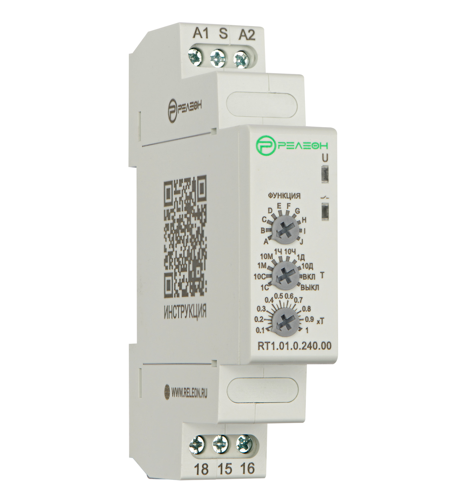 Реле времени RT1 предназначено для управления нагрузкой с заданной пользователем выдержкой по времени с выбранной функцией последовательности. Реле имеет 10 различных функций (A,B,C,D,E,F,G,H,I,J). Функции описаны в преимуществах. С диаграммами функций можно ознакомиться в изображениях товара.