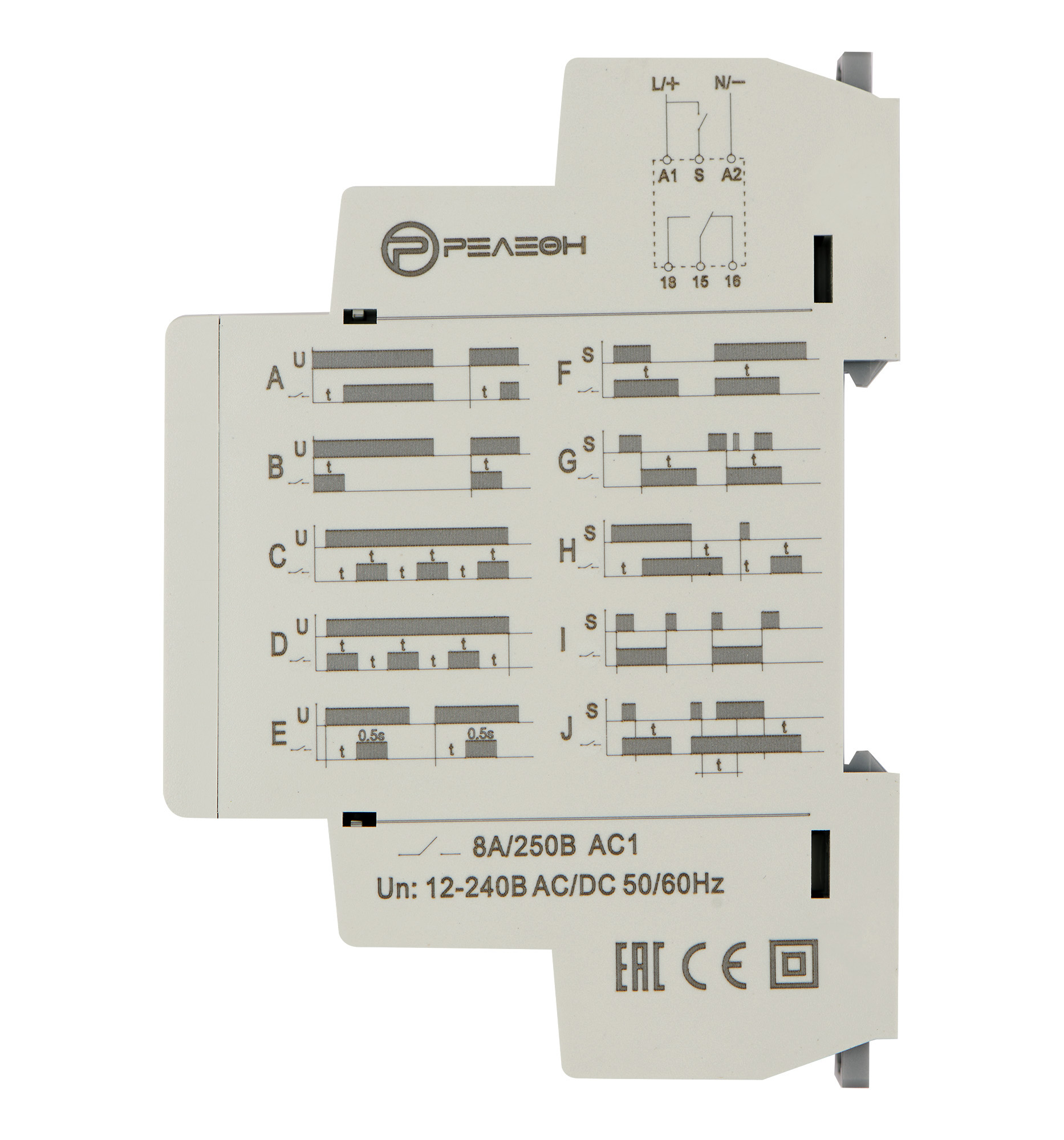A - Задержка включения. B - Импульс при включении.|C - Симметричный повтор цикла (начал. импульс ВЫКЛ). D - Симметричный повтор цикла (начал. импульс ВКЛ).|E - Задержка формирования импульса 0,5 сек.|F - Импульс по управляющему сигналу.|G - Задержка включения по сигналу с последующей задержкой выключения.|H - Задержка включения и отключения с управляющим сигналом.|I - Импульсный режим. J - Задержка отключения по сигналу с продлением. |