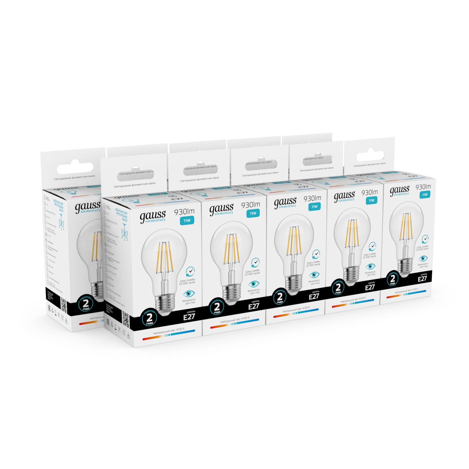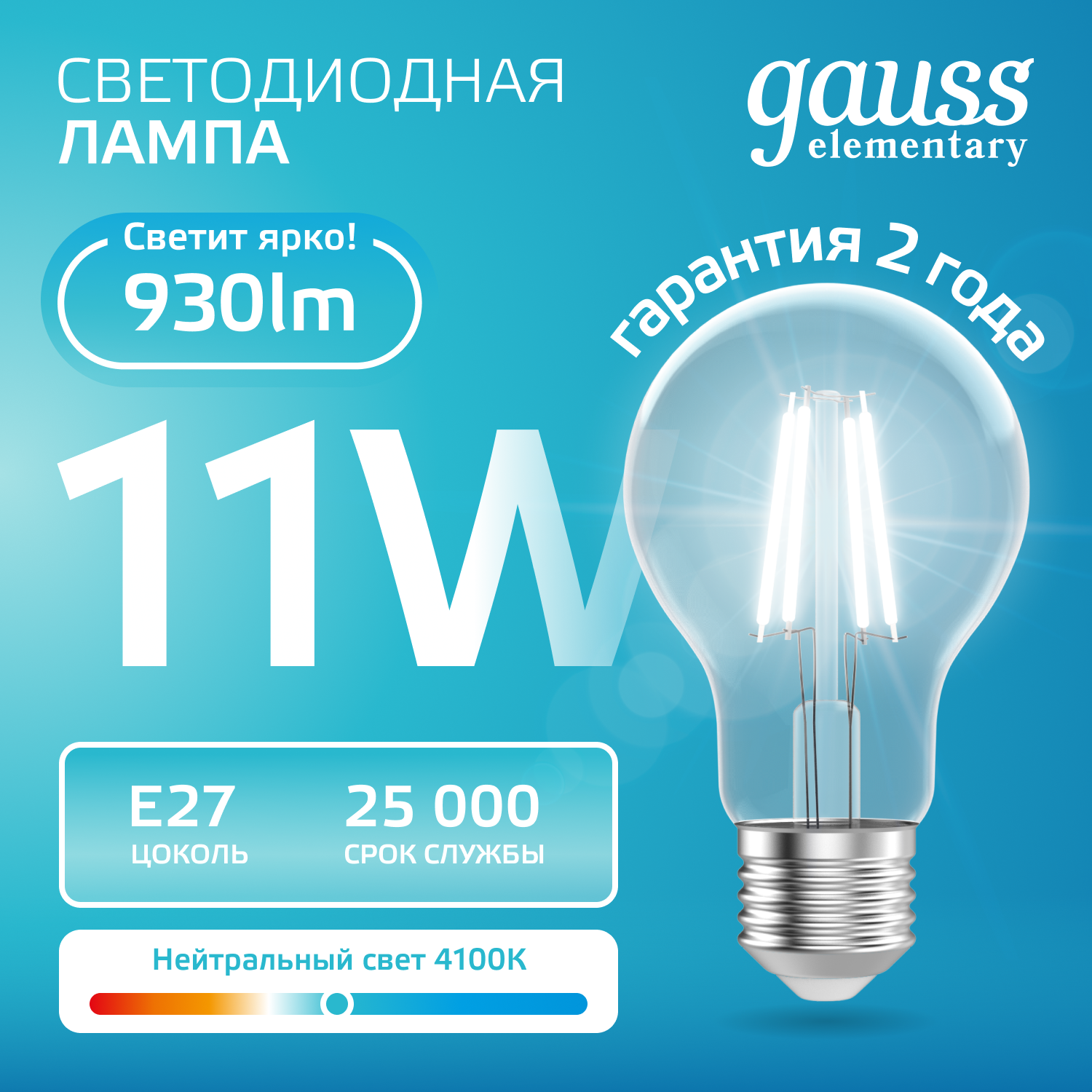 Лампа светодиодная филаментная LED 11 Вт 930 лм 4100К А60 груша нейтральный E27 AC 220В прозрачная колба Elementary