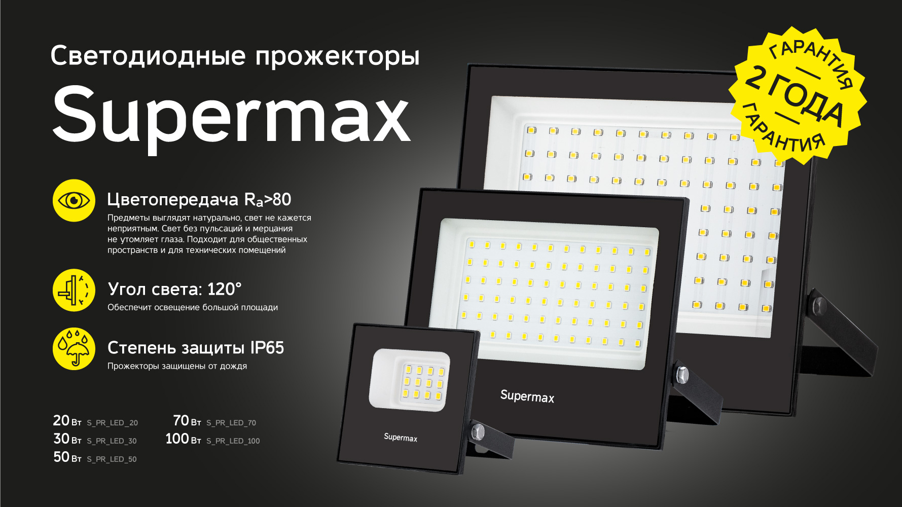 Светодиодный прожектор SUPERMAX обладает регулируемой лирой-креплением, которая позволяет поворачивать прожектор на 180 градусов, а также степенью защиты от пыли и влаги по стандарту IP65 - поэтому прожектор подходит для установки как в закрытом помещении, так и на улице. Мощность прожектора 30Вт, что является аналогом галогенового на 200 Вт, великолепная и практичная замена классическому прожектору. Служат до 40 000 часов, оттенок света – дневной белый 6500К, световой поток 3000Лм. 2 года гарантии.