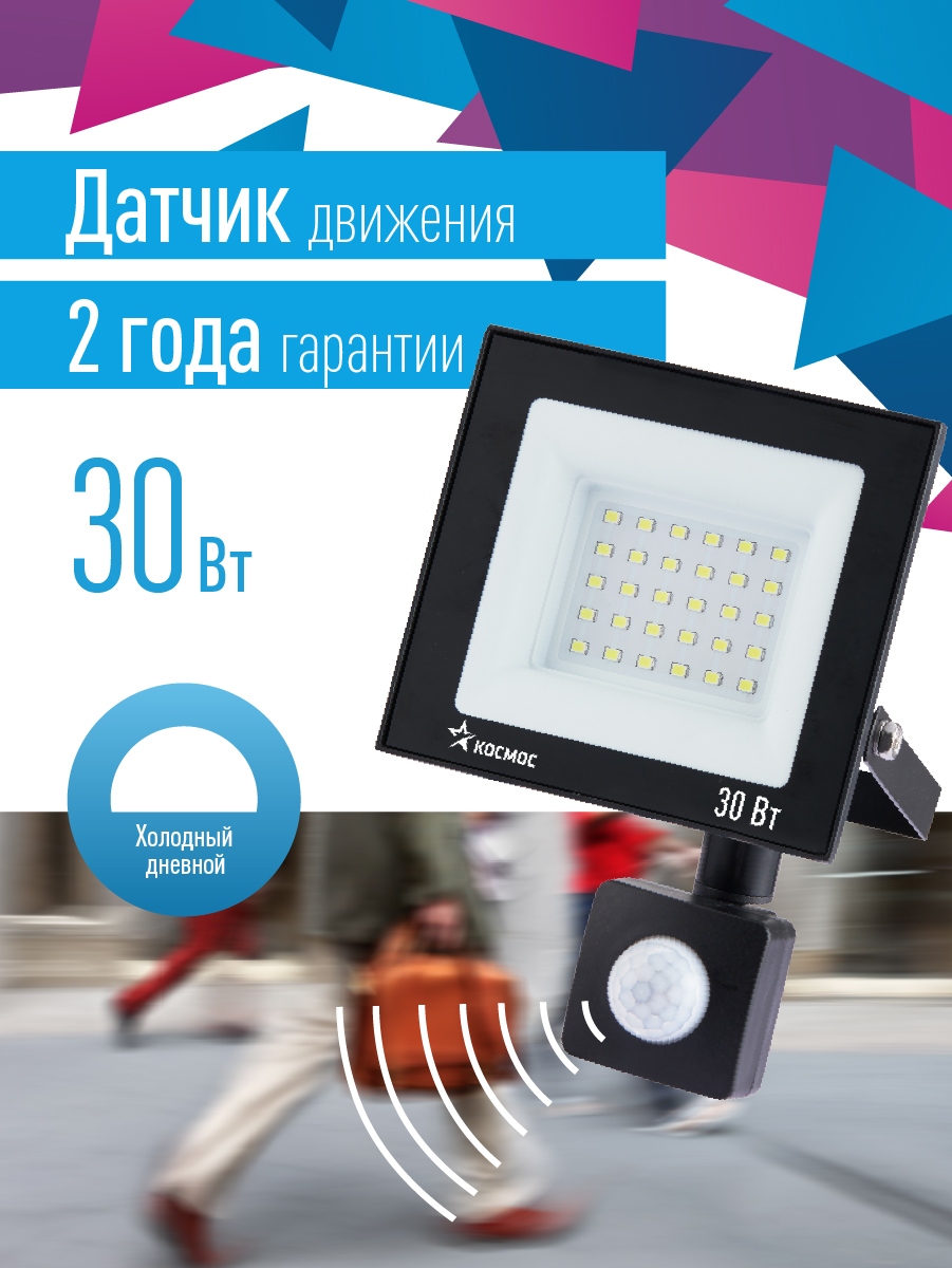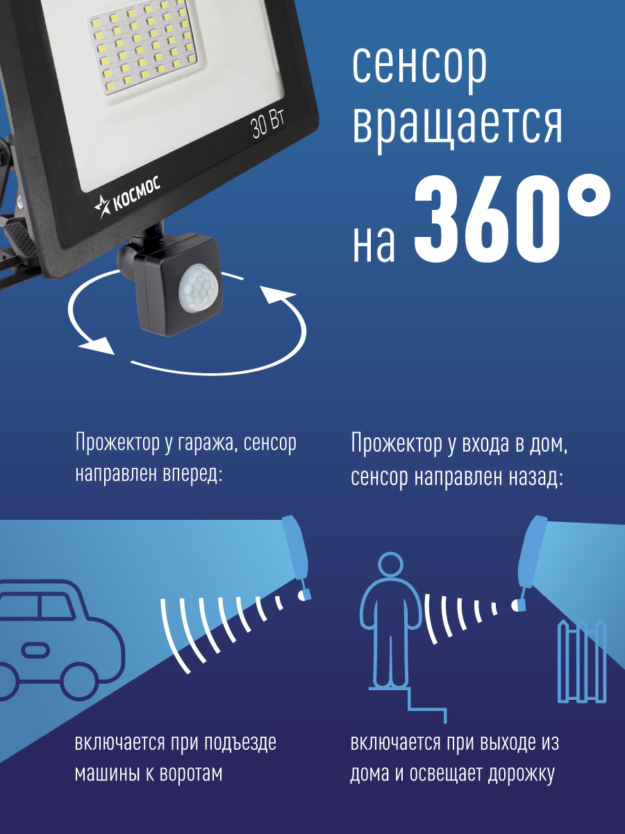 Светодиодный прожектор Космос с широким углом света 120 градусов и регулируемой лирой-креплением (поворачивается под углом до 180 градусов). Степень защиты IP65 - подходит для улицы и заменяет энергоемкие галогеновые прожекторы. Аналог по мощности 200 Вт. Служат до 40 000 часов, оттенок света - дневной белый 6500К. 2 года гарантии. Оснащен сенсором (датчиком движения) - сенсор вращается на 360 градусов и регулируется вверх-вниз, таким образом сенсор можно направить к источнику движения, а свет прожектора - в любую удобную сторону. Пример - сенсор направлен внутрь входа в дом, а прожектор на дорогу от дома, при появлении выходящего из дома человека прожектор осветит дорожку от дома.