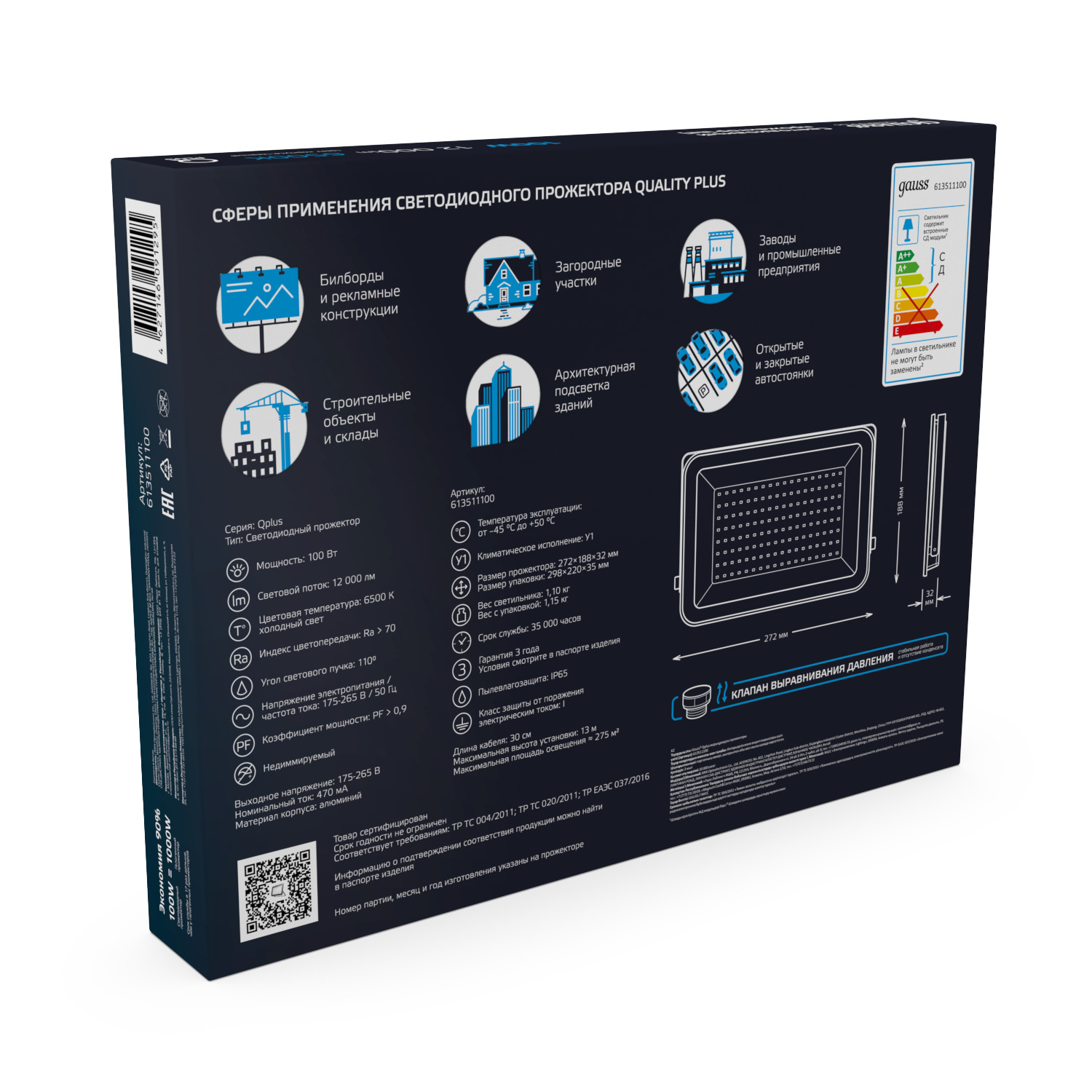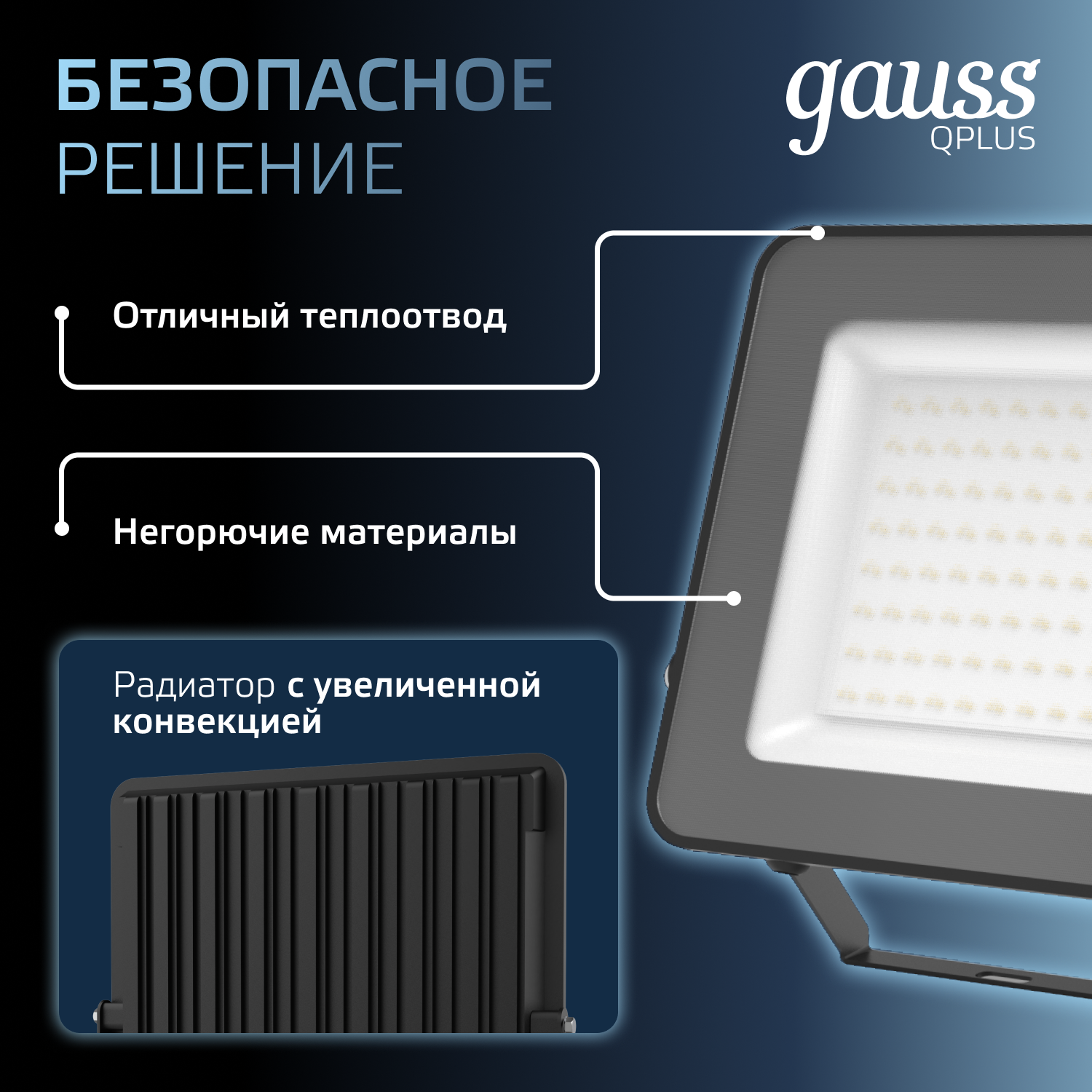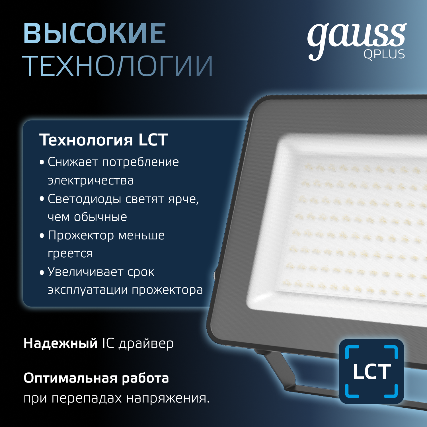 Светодиодные прожекторы Gauss серии Qplus отличаются высокой светоотдачей более 120 lm/w и предназначены для освещения крупногабаритных помещений и объектов, требующих мощной подсветки. Это могут быть производственные или спортивные площадки, автостоянки, а также фасады зданий. Корпус прожектора Qplus изготовлен из прочного литого алюминия, рассеиватель микропризма выполнен из закаленного стекла. Экономичная LED технология сокращает до 90% затрат на электроэнергию, а технология LCT продлевает жизнь светодиодам за счет пониженной подачи напряжения 60% от номинальной. Материалы изготовления и конструкция прожекторов Qplus обеспечивают их высокую механическую прочность и полную защиту от пыли и влаги по классу IP65. Для удобства использования и монтажа, светильники оснащены силиконовым кабелем длиной 30 см.