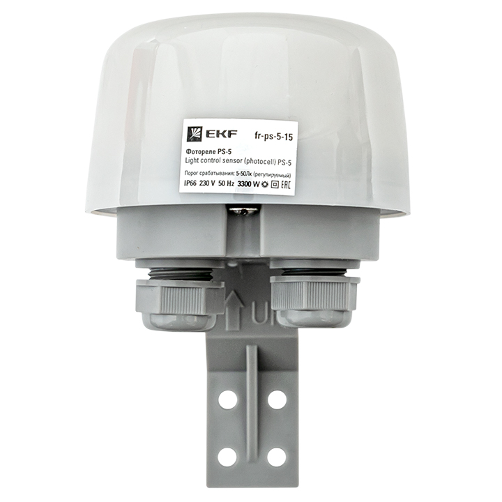 Фотореле PS-5 применяется для управления освещением или другой нагрузкой в зависимости от уровня освещенности. Обычно фотореле применяется в системах управления уличным освещением и включает/выключает нагрузку в момент захода/восхода солнца. К фотореле допускается прямое подключение нагрузки с током не более 15А. Нагрузка большей мощности может быть подключена при помощи контактора. Порог срабатывания по освещенности настраивается в диапазоне 5-50 лк. Фотореле имеет степень защиты IP66, что позволяет устанавливать его в условиях сильного воздействия пыли и влаги.