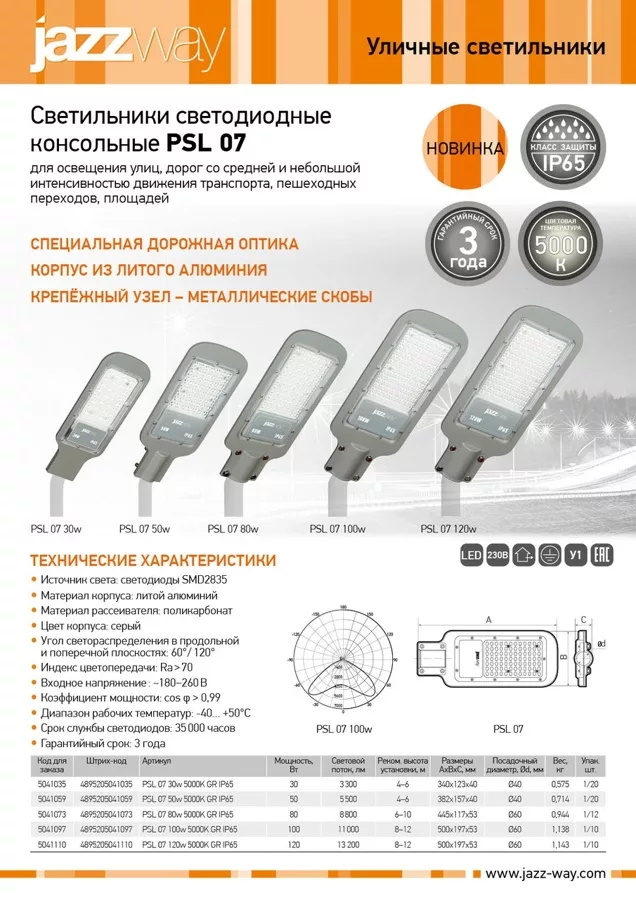 Светильник светодиодный уличный ДКУ-120Вт 5000К 13200Лм посадочный диаметр 60 класс энергоэффективности A++ индекс Ra>70 -40...+50C IP65 гарантия 3года
