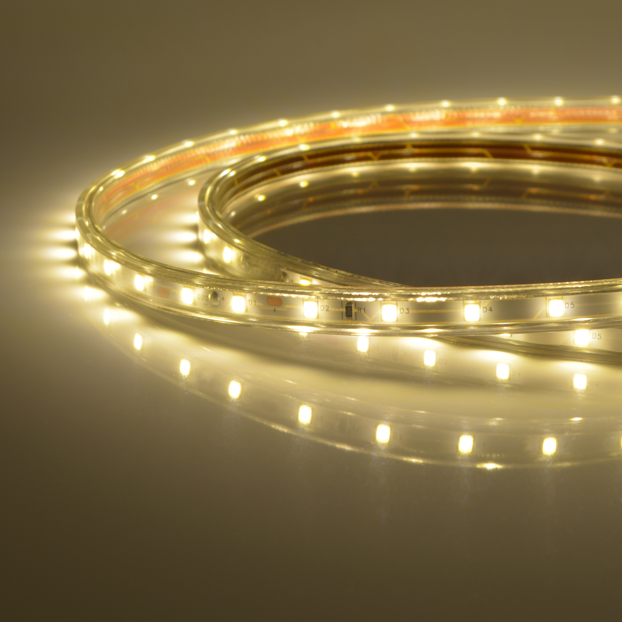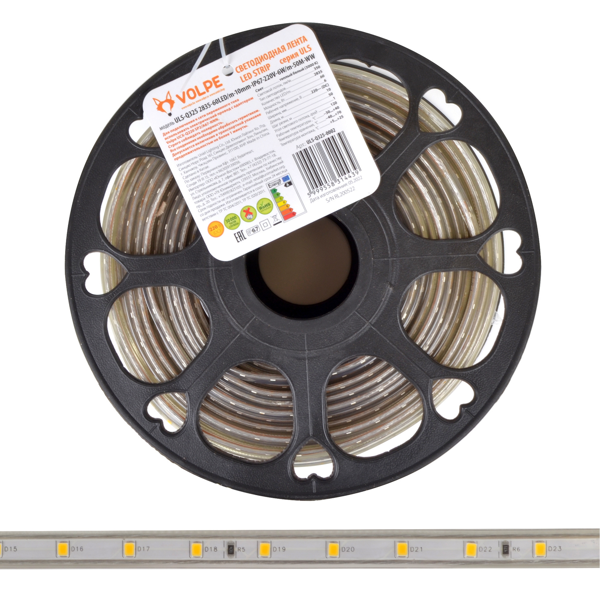 Лента светодиодная гибкая герметичная ULS-Q325 2835-60LED/m-10mm-IP67-220V-6W/m-50M-WW В ПВХ трубке. Упаковка - бобина 50 м. IP67. Угол излучения 120. Кратность резки 1 м. Теплый белый свет.
