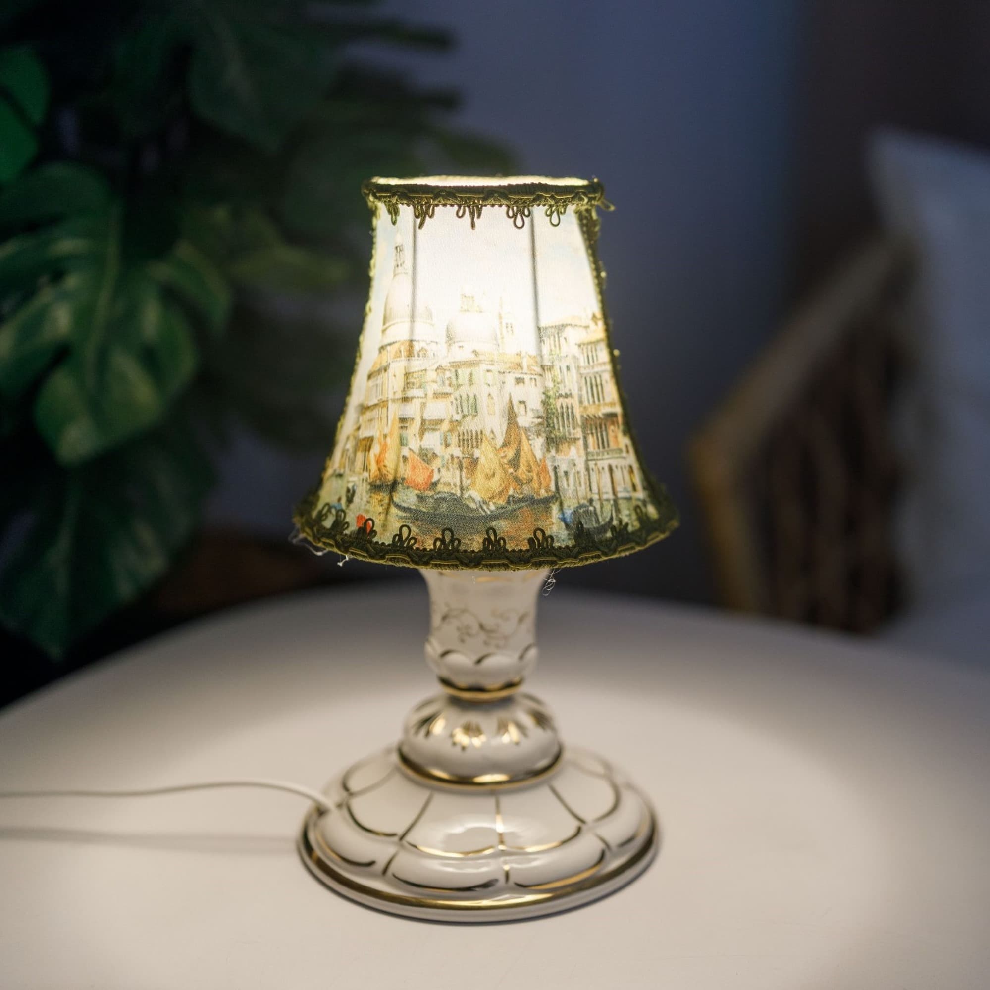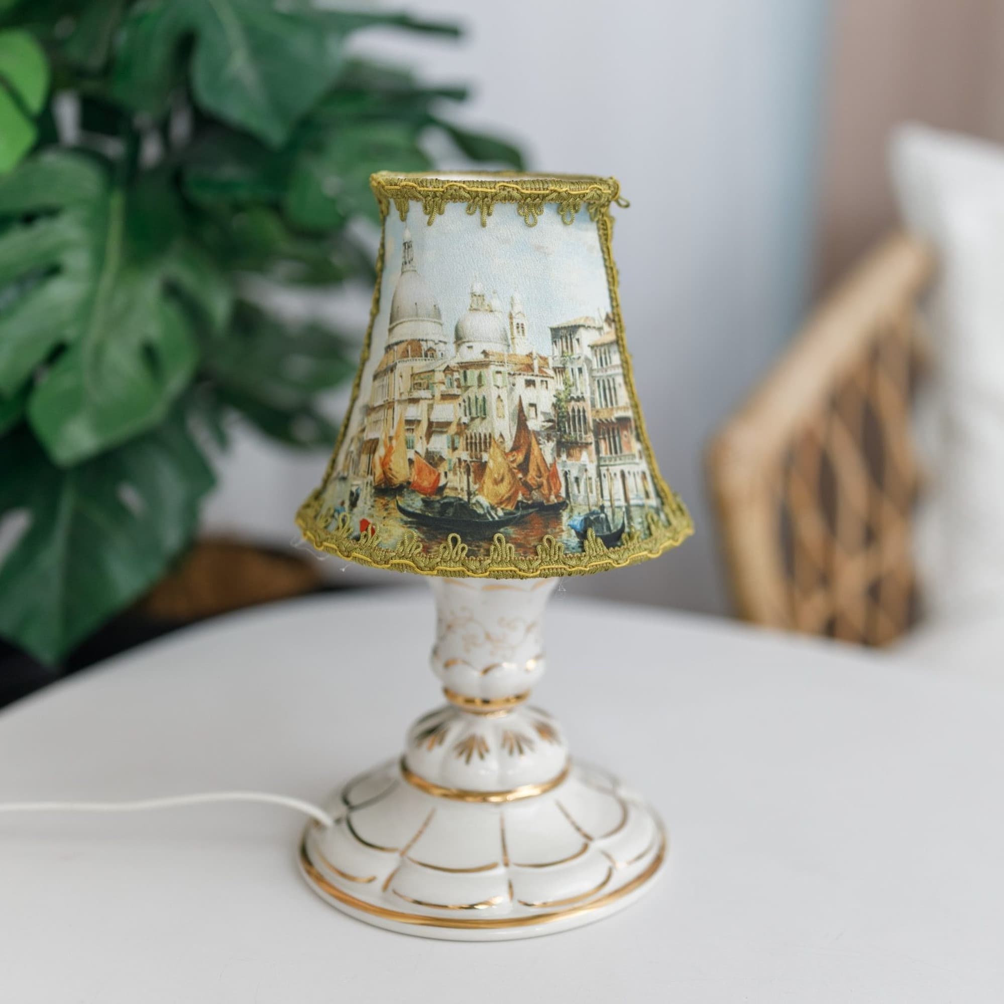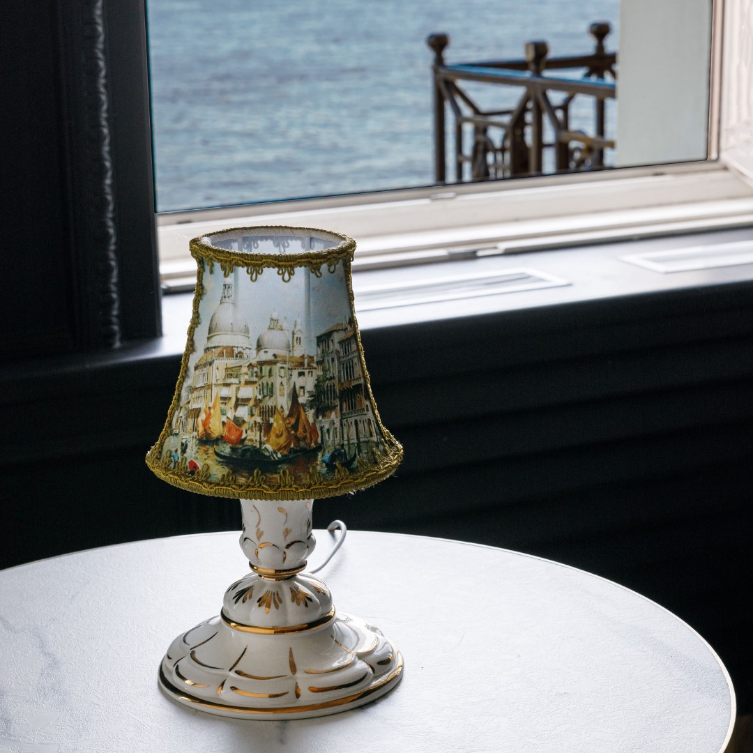 Каналы, гондолы, мосты и соборы – это Венеция, город романтиков и влюблённых. Для них была создана коллекция светильников с изображением живописного вида этого незабываемого города. Миниатюрный НАСТОЛЬНЫЙ СВЕТИЛЬНИК Малютка с абажуром Венеция станет изысканным украшением Вашего прикроватного столика. ГАБАРИТЫ. Высота – 29 см, нижний диаметр абажура – 16 см, диаметр основания – 16 см. ОСНОВАНИЕ из фарфора исключительного качества расписано 24-каратным золотом вручную мастерами Гжельского завода. Узор каждой фарфоровой детали уникален, поэтому рисунок на изделии может отличаться от представленного на фото. АБАЖУР изготовлен из ткани с фотопечатью.
