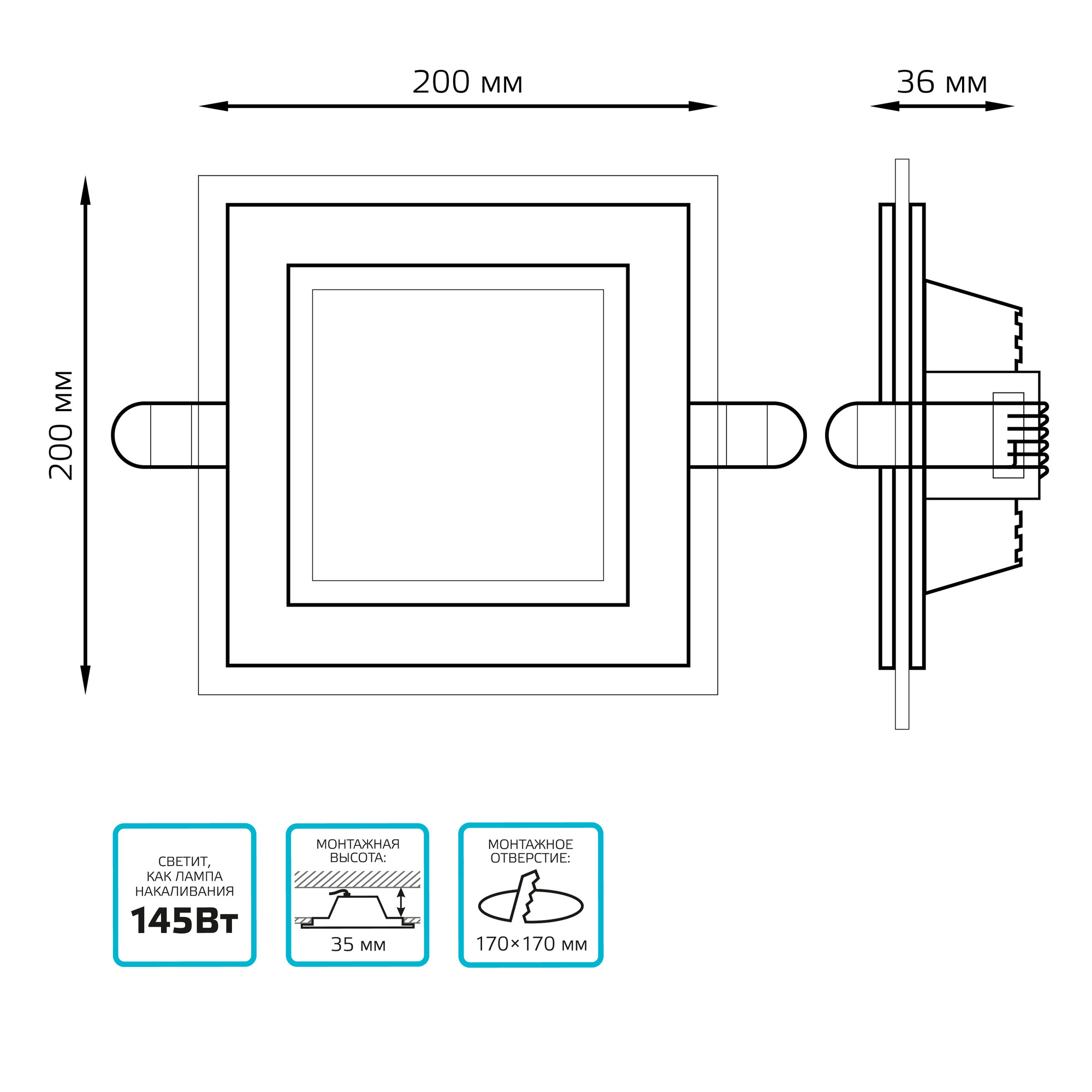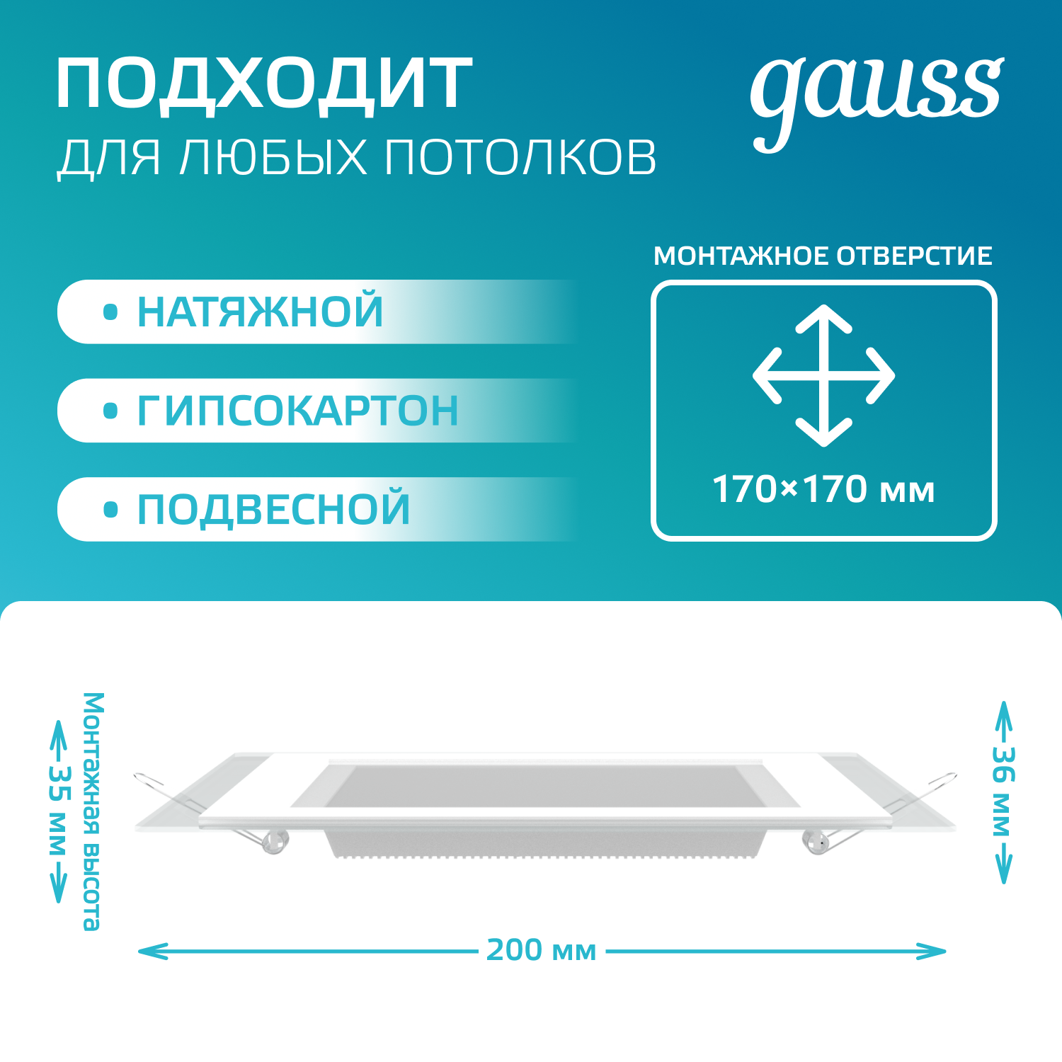 Светильник светодиодный ДВО 18 Вт 1480 лм 4000К AC 220В IP20 квадрат 200х200х36мм монт разм 170х170мм Алюминий с декоративным стеклом Glass Gauss