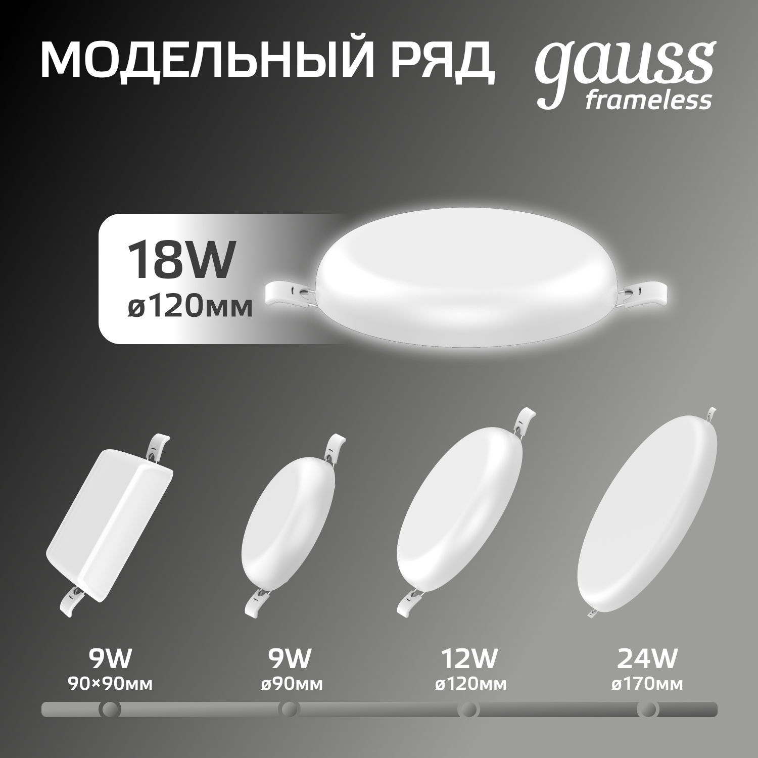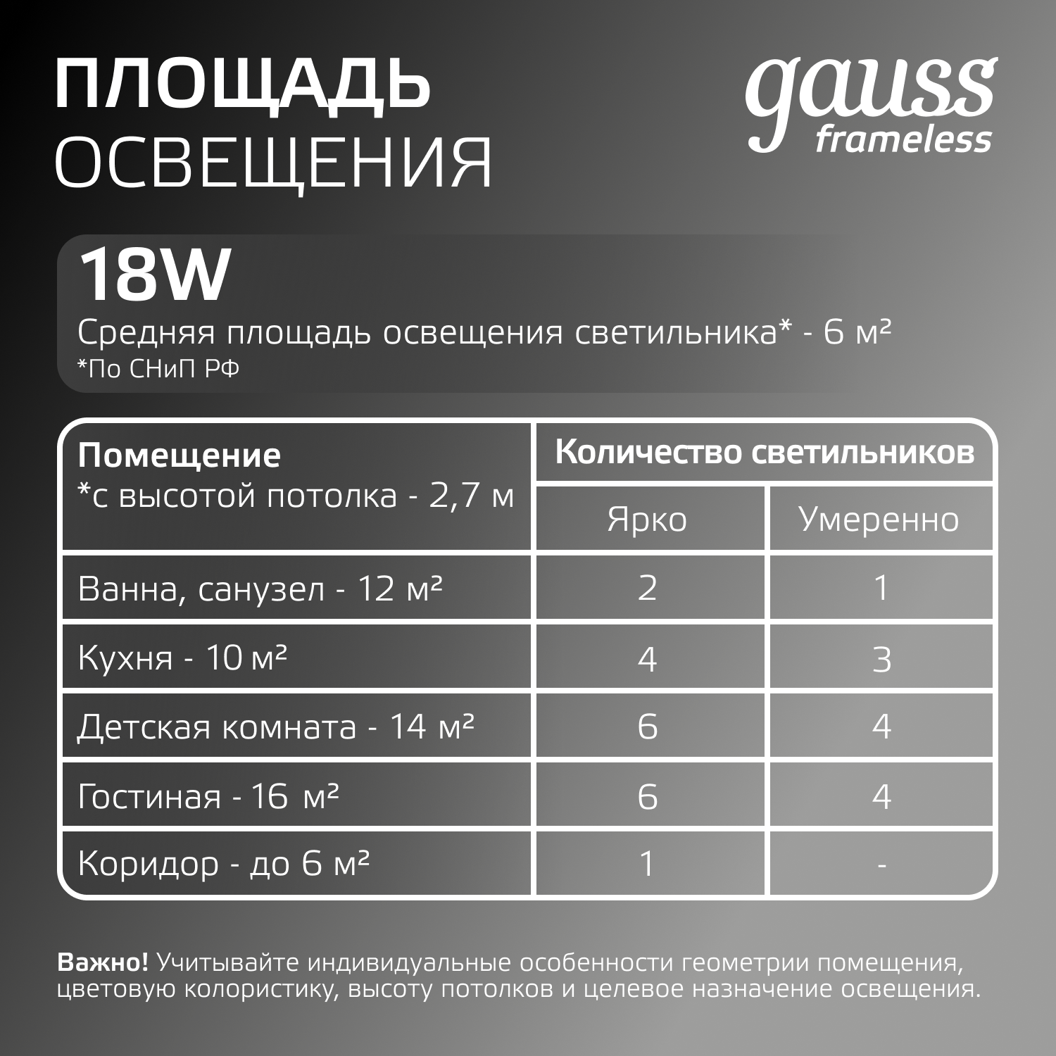 С помощью светильников Frameless от Gauss можно придать интерьеру неповторимый стиль и оригинальность. Потолочные светильники cерии Frameless могут заменить люстру, либо служить в качестве дополнительного источника освещения. Преимущества данной линейки: Монтаж возможен в любые встраиваемые потолочные поверхности, Широкий ассортимент мощностей, Правильное размещение светильников Frameless позволяет добиться равномерной освещенности всего пространства, оптимизировать расходы на электроэнергию и даже визуально увеличить объем помещения. Потолочные светильники Frameless прекрасно подойдут в качестве основного источника освещения в спальнях, прихожих и ванных комнатах.