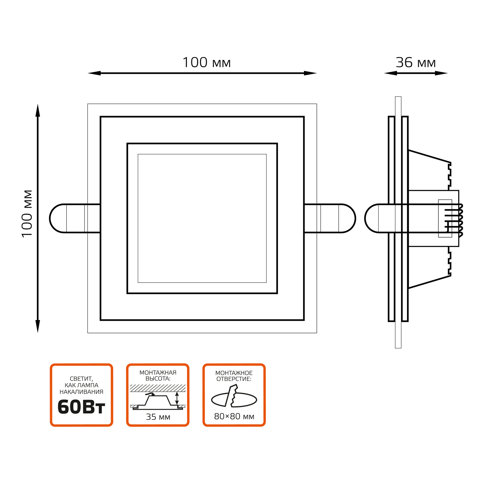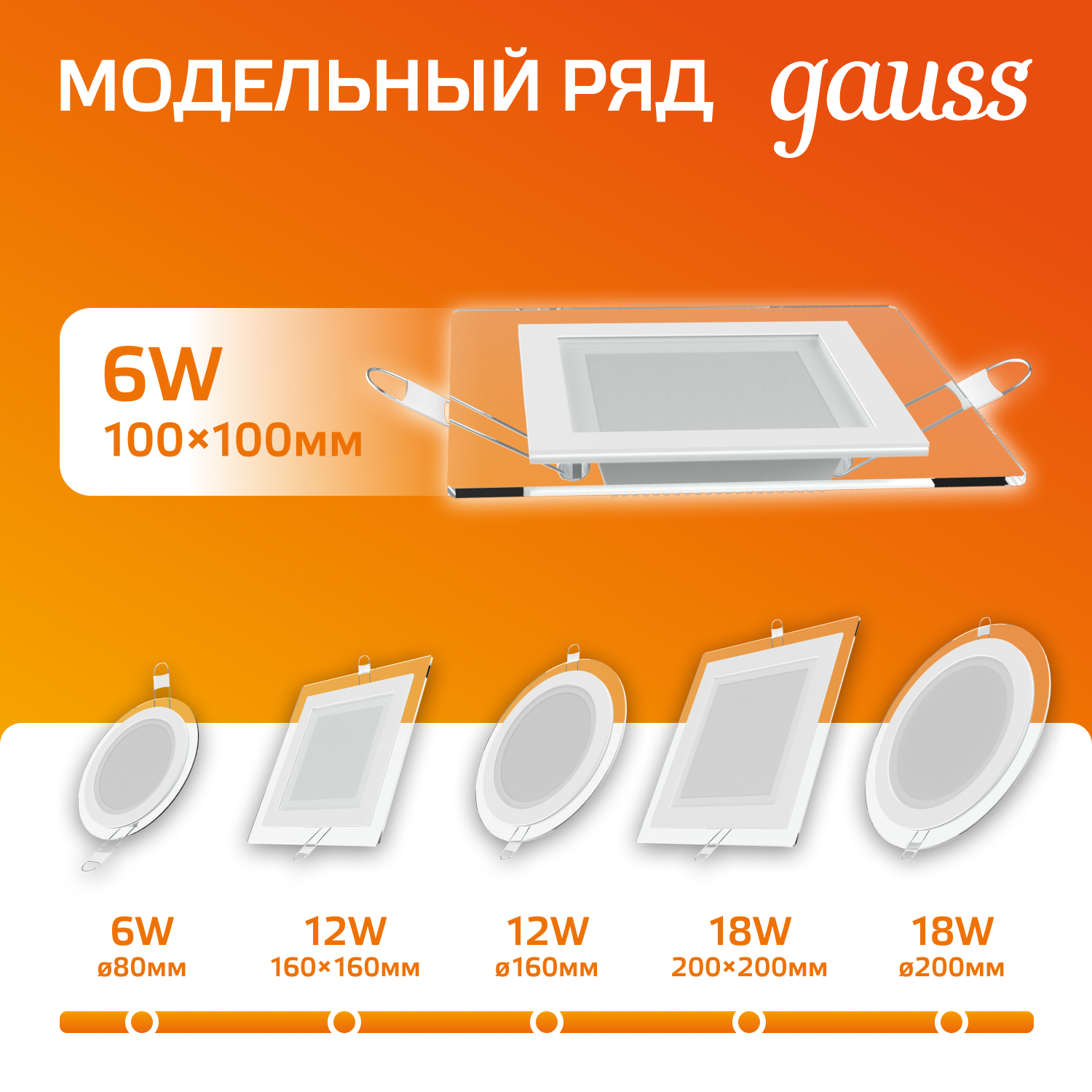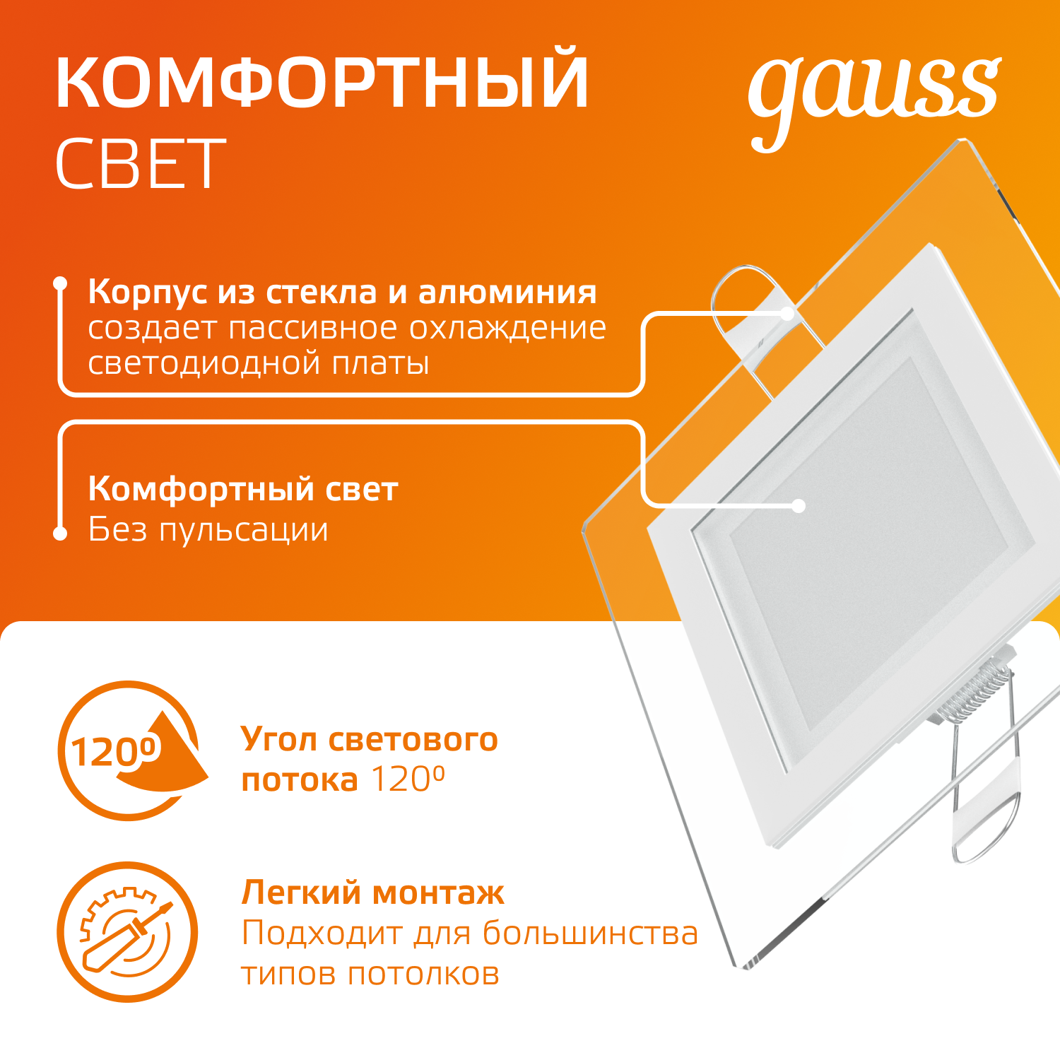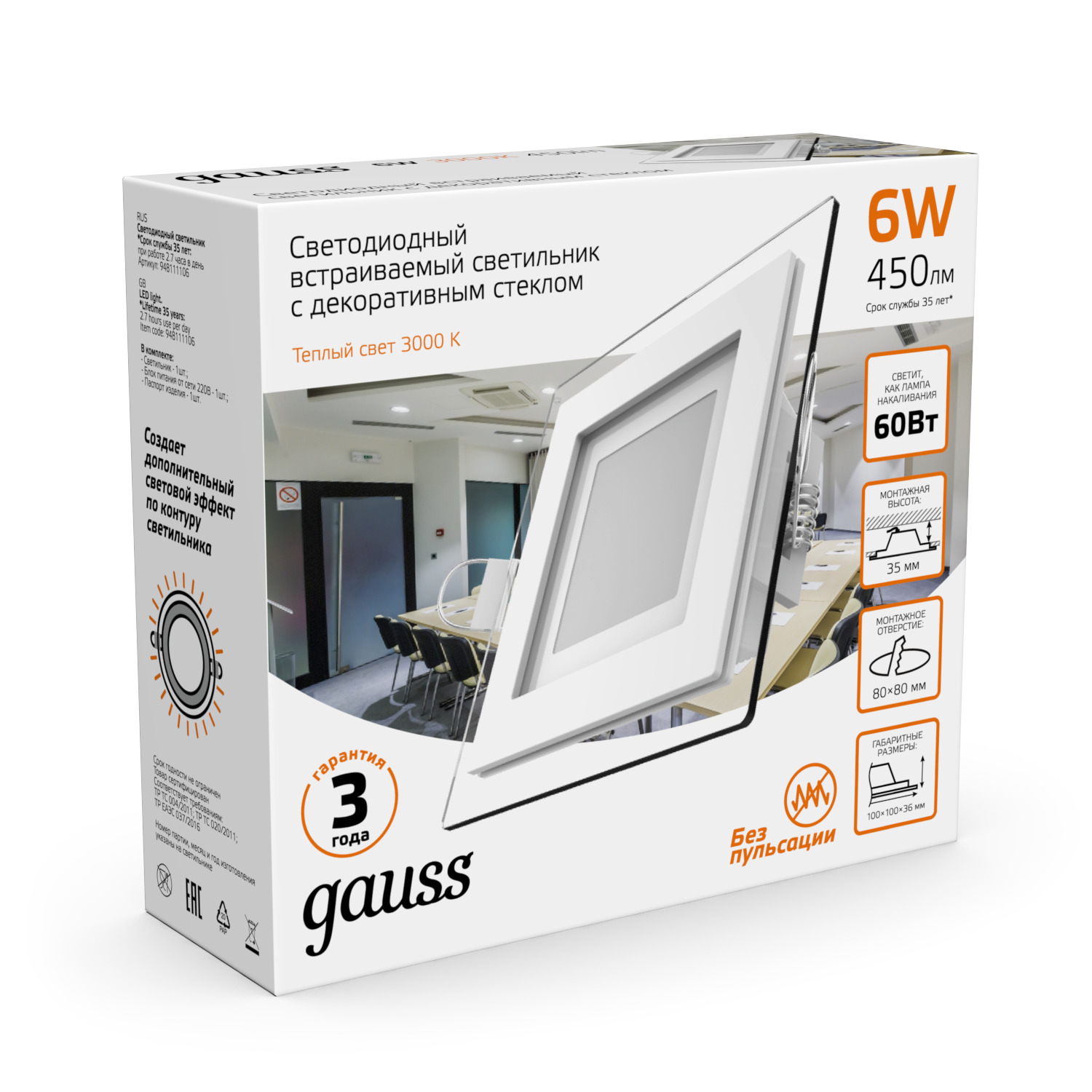 Светильник светодиодный ДВО 6 Вт 450 лм 3000К AC 220В IP20 квадрат 100х100х36мм монт разм 70х70мм Алюминий с декоративным стеклом Glass Gauss